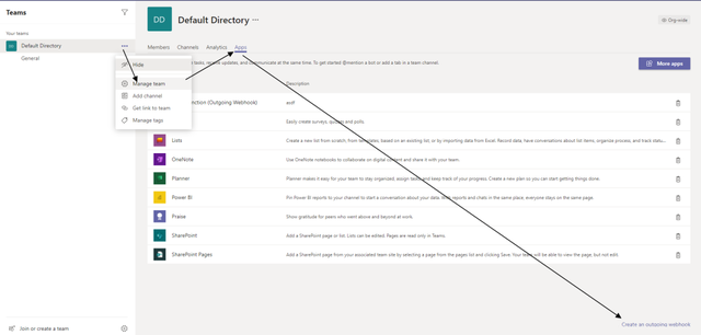 上面已经将服务部署在Azure Functions上,接下来打开Teams进行Webhook配置。