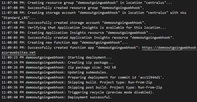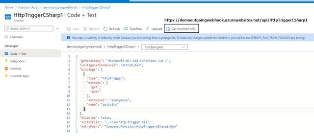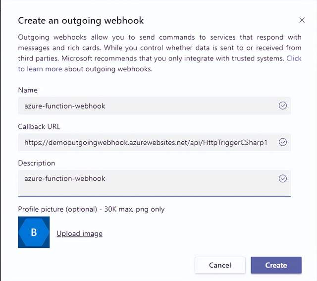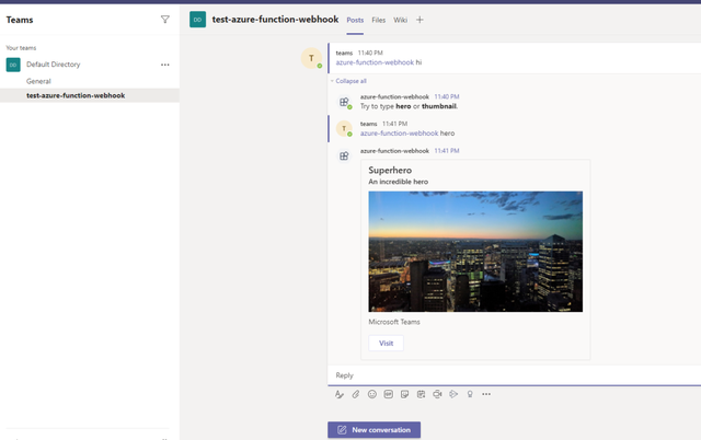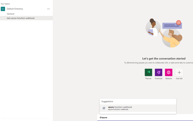 以上已经成功创建了outgoing webhook,并且这个hook是调用到azure function的。现在测试一下效果。