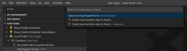3. 选择deploy到已有的function app还是新建,根据自己需要。我这里直接覆盖已有的。
