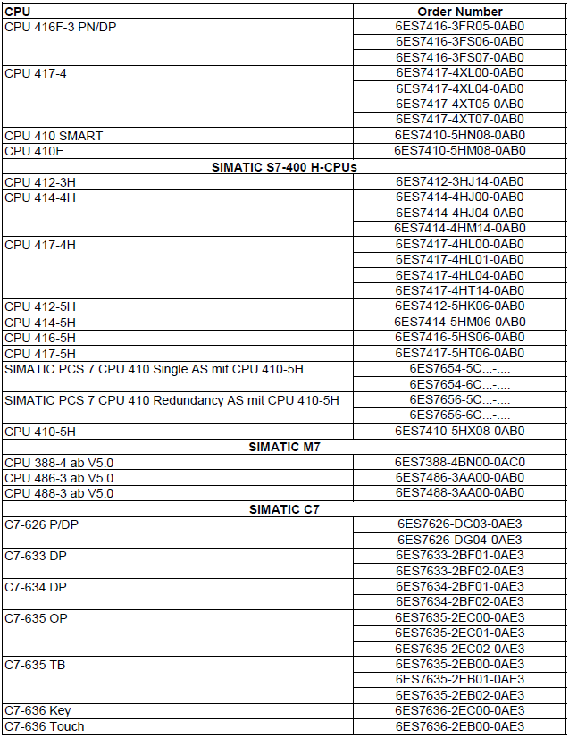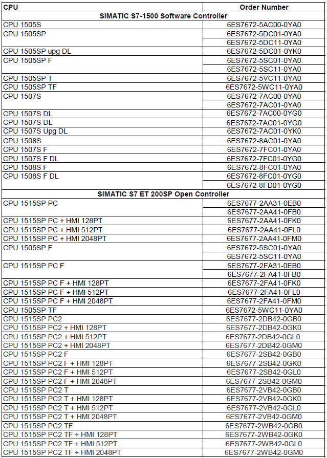 WinAC | Version | Article number | WinAC RTX | V4.0 或更高 | 6ES7671-0R... | WinAC Slot 412 | V3.2 或更高 | 6ES7673-2C... | WinAC Slot 416 | V3.2 或更高 | 6ES7673-6C... | WinAC MP | V4.1 或更高 | 6ES7671-4EE00-0YA0