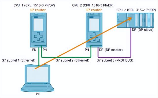 【一】S7-路由功能以及示例 在S7子网中S7路由功能可以用于以太网、PROFIBUS、MPI 的子网,通过PG/PC可以跨子网的限制访问设备。例如: - (1)下载用户程序