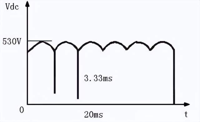 当变频器不发生缺相的正常情况下工作时,Udc上的电压如图2所示,一个工频周期内将有6个波头,此时直流电压Udc将不会低于470V,实际上对于一个7.5kW的变频器而言,其C的值大小一般为900uf,当满载运行时,可以计算出周期性的电压降落大致为40V,纹波系数不会超过7.5%。而当输入缺相发生时,一个工频周期中只有2个电压波头,且整流电压最低值为零。此时在上述条件下,可以估算出电压降落大致为150V,纹波系数要达到30%左右。