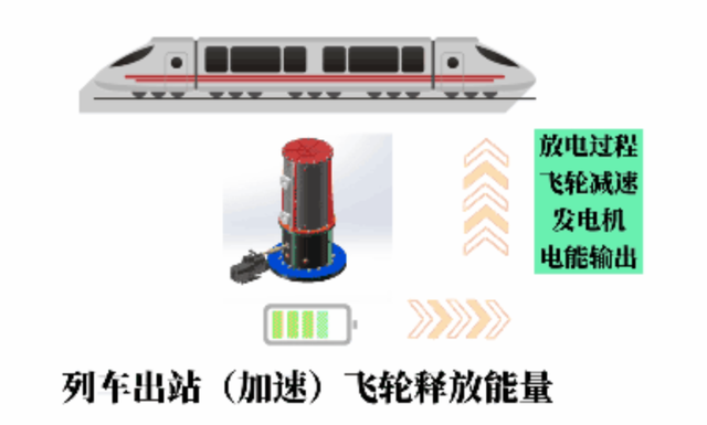 地铁列车通过直流母排提供直流电,直流母排相当于地铁的电源,飞轮系统与直流母排相关。列车进站时,母排的电压升高,为飞轮系统提供电能,飞轮系统吸收能量,将电能转换成动能储存起来,转速高达每分钟20000转。列车启动时,母排电压下降,飞轮系统释放能量,把动能转换为电能,反馈到母排中,供列车使用。