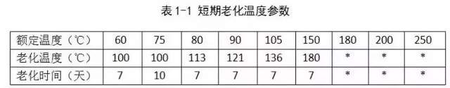 材料的短期老化温度,即我们平常在标准中最常见的7天、10天等,如105℃的材料,老化条件为136℃×7天。那这和额定温度是什么关系呢?在UL标准中,短期老化的温度是靠材料的长期使用经验获得的,但也总结了一些方法来确认。如在UL2556-2007标准4.3.5.6章及附录D中这样确定一个材料的短期老化温度。首先按照表1-1选择一个额定温度、老化温度和老化时间。