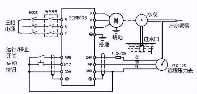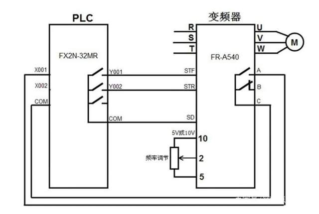 这种情况使用一个自保按钮开关就可以满足变频器的启停控制,多出来的一个开关,可以用来做故障复位,接到RST上,当然是用非保持的开关更理想,当变频器有故障的时候,按一下复位开关,就可以清楚变频器的故障了。因为没有单独的电位器给定,这时候可以通过操作面板来给定频率。