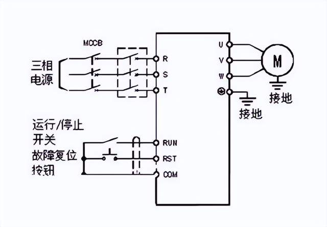 变频器只通过RUN端子给高电平,变频器就可以启动了,当开关断开,相当于RUN端子变成了低电平,变频器就停止运行了。
