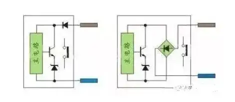 注:24VDC供电的传感器,在输入回路上需要串联限流电阻,R1为10Ω,R2为2KΩ,不串联限流电阻,将烧毁接口回路,限流电阻取值2.7KΩ。 三、外部输入元件 1、无源干接点(按钮开关、行程开关、舌簧磁性开关、继电器触点等) 无源干接点比较简单,接线容易。不存在电源的极性,压降等因素,上图3-6中的输入元件这是此类型。这里不重复介绍。 2、有源两线制传感器(接近开关、有源舌簧磁性开关) 有源两线接近开关分直流与交流,此传感器的特点就是两根线,传器输出端导通后,为了保证电路正常工作需要一个保持电压来维持电路工作,通常在3.5-5V的压降,静态泄露电流要小于1mA,这个指标很重要;如果过大,在接近开关没检测信号时,就使PLC的输入端的光电耦合器导通。我公司的LJK系列两线制接近开关静态泄露电流控制在0.35-0.5mA之间适应各类型PLC。 直流两线制接近开关分二极管极性保护与桥整流极性保护,前者在接PLC时需要注意极性,后者就不需要注意极性。有源舌簧磁性开关主要用在汽缸上做位置检测,由于需要信号指示,内部有双向二极管回路,因此也不需要注意极性;交流两线制接近开关就不需要注意极性。如图10: