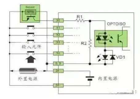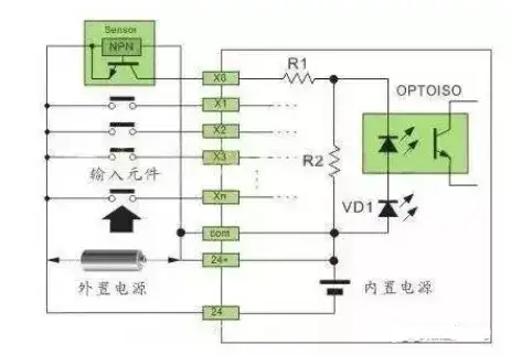 一、概述 PLC 的数字量输入接口并不复杂,PLC 为了提高抗干扰能力,输入接口都采用光电耦合器来隔离输入信号与内部处理电路的传输。因此,输入端的信号只是驱动光电耦合器的内部 LED 导通,被光电耦合器的光电管接收,即可使外部输入信号可靠传输。
