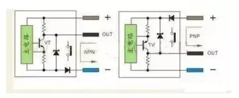 (3)S/S端子接法参考图5-图6以及图11-图12。 3、有源三线传感器(电感接近开关、电容接近开关、霍尔接近开关、光电开关等)直流有源三制线接近开关与光电开关输出管使用三极管输出,因此传感器分NPN和PNP输出,有的产品是四线制,有双NPN或双PNP,只是状态刚好相反,也有NPN和PNP结合的四线输出。 NPN型当传感器有检测信号VT导通,输出端OUT的电流流向负极,输出端OUT电位接近负极,通常说的高电平翻转成低电平。 PNP型当传感器有检测信号VT导通,正极的电流流向输出端OUT,输出端OUT电位接近正极,通常说的低电平翻转成高电平。 电路中三极管的发射极上的电阻为短路保护采样电阻2-3Ω不影响输出电流。三极管的集电极的电阻为上拉与下拉电阻,提供输出电位,方便电平接口的电路,另一种输出的三极管集电极开路输出不接上拉与下拉电阻。 简单说当三极管VT导通,相当与一个接点导通,如图13: