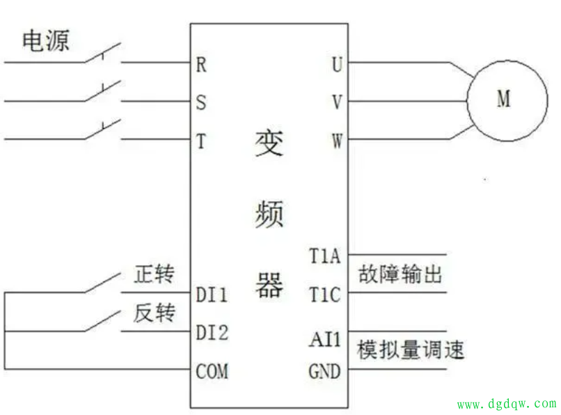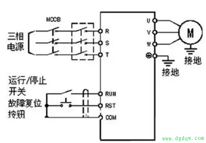 对于故障复位功能,通常使用非自保式按钮开关连接至变频器的RST端子。当变频器检测到故障并停机时,按下复位按钮可清除故障信息并尝试重新启动。