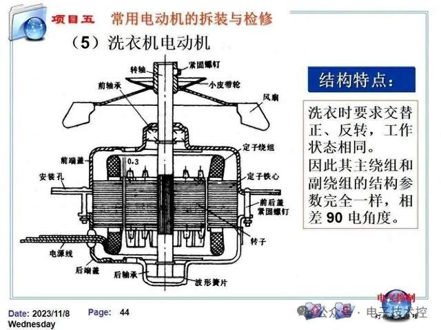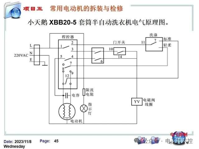 洗衣机电动机结构 洗衣机电机是由转轴、前轴承、小皮带轮、风扇、定子绕组、前端盖、定子铁芯、转子、后端盖、后轴承、波形弹片组成。 洗衣机电机绕组结构特点:洗衣时要求交替正、反转,工作状态相同。因此其主绕组和副绕组的结构参数完全一样,相差 90 电角度。 小天鹅 XBB20-5 套筒半自动洗衣机电气原理图。