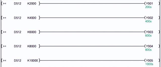 如下图,指示灯的控制通过判断语句(大于等于指令),时间大于200s就点亮Y1,时间大于400s就点亮Y2,时间大于600s就点亮Y3,时间大于800s就点亮Y4,时间大于1000s就点亮Y5。