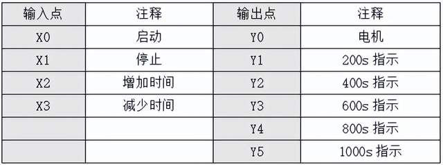【动作描述】 1.控制一台电动机,按下启动按钮,电机运行一段时间自动停止;按下停止按钮,电机马上停止。 2.电机运行的时间可以通过2个按钮来调整,按一下增加的按钮,增加10秒,最大增加到1000秒;按一下减少按钮,时间减少10秒,最低减少到60秒。 3.希望调整的时间能够掉电保存,不会因为断电而需要重新设置。 4.希望用Y点做指示灯,200s时间时,Y1点亮;400s时间时,Y2点亮;600s时间时,Y3点亮;800s时间时,Y4点亮;1000s时间时,Y5点亮。 【I/O分配】I/O分配如表,有4个输入点,6个输出点。
