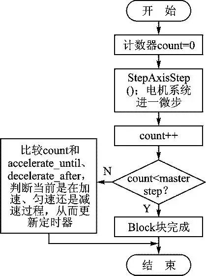 在系统中的多个用户任务进程中,电机驱动进程是最重要的,它实际上完成了对步进电机最底层的控制,为了保证当前运动指令下电机运行的流畅,此进程对时间要求非常敏感,它在系统中决定了电机运动速度的上限。进程流程图如图5所示,此进程用一个不断循环的函数实现,对应于规划管理进程不断向Planner结构体中填充块数据,电机驱动进程则不断从Planner中取出块数据,根据Block块中的参数启动Timer定时器,首次设置定时器参数,最终在定时器中断服务函数中驱动电机运动。