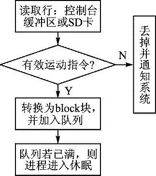 系统的实际使用状态通常为一端不断读取运动指令,另一端不断驱动多路步进电机移动。两端中间存在一个结构体队列来缓冲两端执行速度的差异,进程的结构流程图如图4所示。