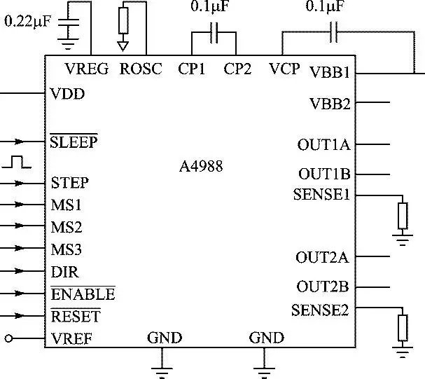 本设计电路中主控制器采用ST公司的STM32F4系列微控制器,电机驱动芯片采用A4988,作为执行机构的步进电机使用两相四线的42步进电机。