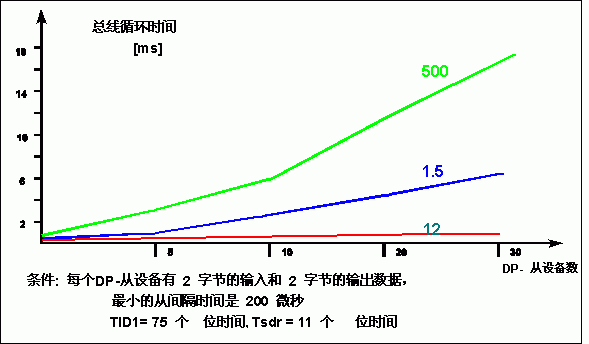 图1如果实际应用问题对系统响应有一定的实时要求。可根据具体情况分析是否采用总线技术。 对Profibus-DP,以下数据仅供参考。当总线具有32个从站,数据传输速率为12M时,总线循环时间为1毫秒。见图2。