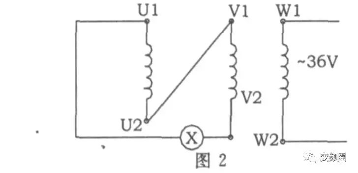 如图 2 所示 , 将 U2 、V1 连接起来 , 构成两相绕组串联 ,将 U1 、V2 线头接上一只灯炮 W1 、W2 两个线头上接通 36 V 交流电源。