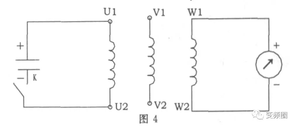 按图 4 接线 , 合上开关瞬间 , 若指针摆向大于零的一边 ,则接电池正极的线头与万用表负极所接的线头同为首端或尾端; 如指针反向摆动 , 则接电池正极的线头与万用表正极所接的线头同为首端或尾端。再将电池和开关接另一相两个线头 ,进行测试 ,就可正确判断各相首尾端。
