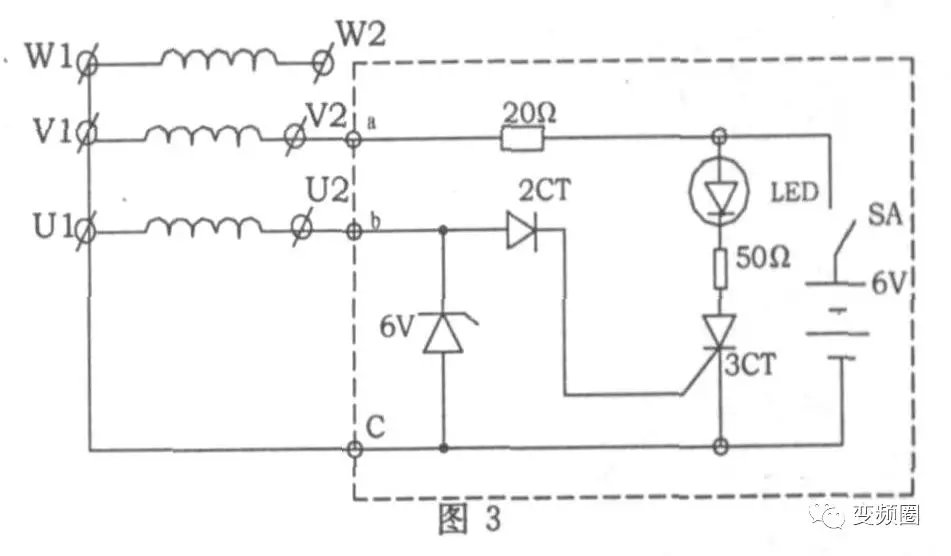 如果 L ED 不亮 ,说明 U1 和 V2 为异名端 , 此时 a 端为正 , b 端为负 , 3 CT 正向阻断 , L ED 不亮。同理 ,将 V2 从 a 端移开 ,将 W2 接 a 端 ,重复上述方法可确定 W2 和 U2 的极性关系。