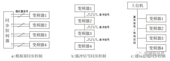 1. 速度同步控制 速度同步控制方式是多台变频器同时按照一样的速度运行的一种控制方式。速度同步控制方式一般有模拟量同步控制、脉冲信号同步控制和通讯总线控制等方法(如图2)。