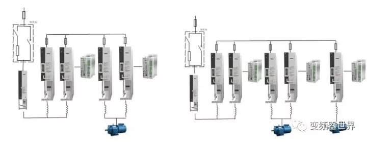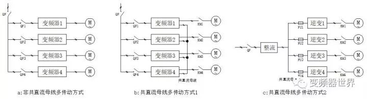 一. 多传动变频系统的基本组成多传动变频系统上的多台独立变频器来完成各自电动机的控制要求,这种方式最为简单,使用普通的变频器就能完成,多台变频器可以多路电源供电也可以在前级共用一路电源(如图1-a)。将系统中的多台变频器的直流电源并联连接,这种方式为共直流母线,该方式中一种是将多台普通变频器的直流端并联(如图1-b),一种是由独立的整流装置提供直流电源,多台逆变装置共用此直流电源(如图1-c)。