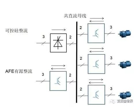 ● 可控硅整流和AFE整流满足不同需求 AS700变频器有可控硅整流和AEF整流两种整流方式。如果将可控硅整流更改为AFE有源整流则可将电机制动的能量回馈电网,达到节能效果。(图4是AS700变频器的两种整流方式示意图)