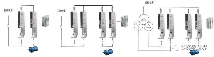 AS700变频器中可控硅整流是共直流母线系统中的单向(电动方向)整流装置,输入侧配有专用的电抗器,可利用并联整流单元方式获得更大功率,支持12、18或24脉冲整流。一般用于对谐波量没有更高要求且不需要能量回馈的场合。图5是AS700工作于两象限中共直流母线变频器系统三种方案图。