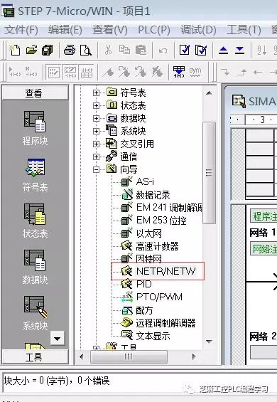 避免简单地定时激活NetR/NetW:由于串行通信的特点,无法得知何时真正结束。如果定时进行网络读写通信,必须判断此次通信是否正常结束 同时有效的NetR/NetW指令不能超过8个,否则通信请求队列会超出操作系统的管理能力 使用SM0.0调用网络读写指令,虽然能长期工作,但不能超过8个指令,而且会出现监控时指令块变为红色的现象,最好还是加上必要的读写状态判断条件。 最简单可靠的方法,是使用Micro/WIN中的NetR/NetWWizard(网络读写指令向导)。