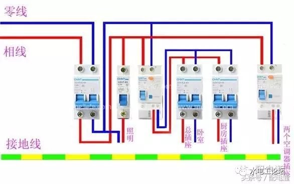 1、住户配电箱总开关一般可以选择双极32—63A小型空气开关或隔离开关; 4、空调回路一般选择16—25A的空气开关; 5、采用双极或1P+N(相线+中性线)空气开关,当线路出现短路或漏电故障时,应立即切断电源的相线和中性线,确保人身安全及用电设备的安全。以上空气开关的安装仅供参考,每户家庭的实际用电器功率不一样,具体要按电工设计为准。 当空气开关是三相开关,要搞清楚入线是不是三相电路。如果确定是两相的,就应该零线接零线,地线接外壳,火线随便接一个就可以了。一般每个空调单独分一路,厨房和卫生的插座分别单独分一路,其余的插座可以根据情况分一到两路,所有的照明也可以分为一到两路。预计要使用大功率电器的插座电路可可以使用20安培的空气开关,否则16安培的空气开关就够了。