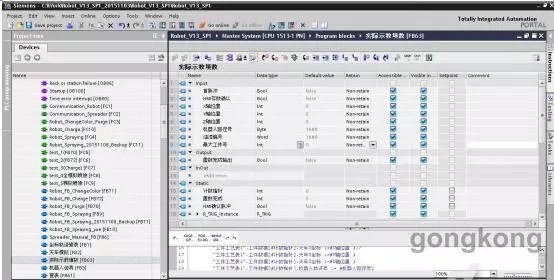 工件工艺数据表的建立过程: ⑴.在TIA博途V13SP1编程软件下,添加一个新的“PLCdatatypes”(相当于Step7里建立的用户自定义DB块),命名为“工件配方”,在里面添加“天车X坐标”(定义为整数数据类型)、“天车Y坐标”(定义为整数数据类型)、“天车Z坐标”(定义为整数数据类型)和“机器人轨迹号”(定义为字节数据类型),外加两个备用数据,防止以后客户提出增加新功能时用,“油漆配方号”(定义为Word数据类型)和“油漆流量”(定义为整数数据类型),现在这两个数据是在画面上直接输入,供漆系统直接接收的。