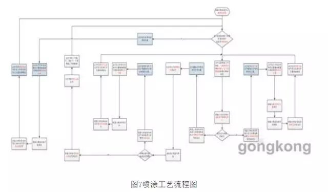 五、喷涂工艺流程及控制的技术要点 悬挂式机器人喷涂系统喷涂工艺流程如下: 首先天车系统、供漆系统和喷涂系统准备就绪,工件进入指定位置,并定位→系统检测工件实际位置→坐标拟合→示教(手动调试程序)→启动运行,总控读取喷漆“工件数据”,发喷涂“轨迹号”和喷涂“配方确认”信号给机器人喷涂系统→机器人喷涂系统读取喷涂“轨迹号”和颜色“配方号”→机器人喷涂系统确定是当前喷涂配方,则给总控发出位置1的“喷涂申请”信号→悬挂系统三轴分别到达指定位置1后,发“天车已到喷涂位置”信号给总控→2KS混合,机器人开始自动喷涂(调用喷涂程序1)→喷涂工件1号区域,喷涂完成,机器人回到HOME位后停止,并给总控发“喷涂完成”信号→总控读取“喷涂完成”信号,变换工件指针,指向2号区域工件数据,发喷涂“轨迹号”和喷涂“配方确认”信号给机器人喷涂系统→机器人喷涂系统读取喷涂“轨迹号”和颜色“配方号”→机器人喷涂系统确定是当前喷涂配方,则给总控发出位置2的“喷涂申请”信号→悬挂系统三轴分别到达指定位置2后,发“天车已到喷涂位置”信号给总控→2KS混合,机器人开始自动喷涂(调用喷涂程序2)→喷涂工件2号区域,喷涂完成后,机器人回到HOME位后停止……
