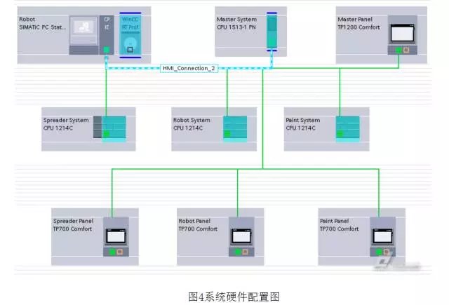 三、控制系统架构 此套系统的总控系统控制器采用西门子S7-1500PLC作为主控制器,WINCCProfessionalV13SP1作为上位机操作画面,TP1200作为操作面板,天车、机器人和供漆系统分别采用S7-1200作为控制器。S7-1500总控系统通过PROFINET总线与喷涂机器人系统、供漆系统和悬挂行走系统通讯,完成系统整体控制,实现对系统运行状态的实时监控及操作,保证对整个工件的连续喷涂。控制系统架构如图4所示,主控系统硬件设备表单,如下表1所示。