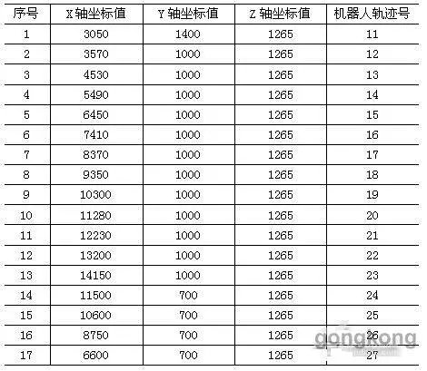 下面是其中一个大机翼示教的数据表,17个定点喷涂,才能完成整个零件的喷涂。 序号X轴坐标值Y轴坐标值Z轴坐标值机器人轨迹号 注:X/Y/Z的单位是mm 表2大机翼示教数据表