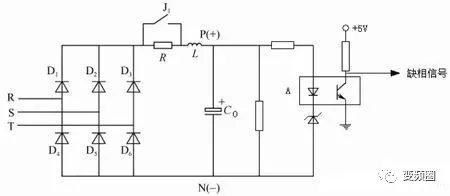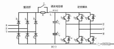 变频器缺相故障维修是常见的故障之一,要知道变频器产品中主要有单相220V与三相380V的区分,当然输入缺相检测只存在于三相的产品中。图1所示为变频器主电路,R、S、T为三相交流输入,当其中的一相因为熔断器或断路器的故障而断开时,便认为是发生了输入缺相故障。 变频器缺相故障除了输入缺相外,还有一种是输出缺相,这将直接导致电机缺相运行。缺相时,电机静止时启动,电机就转不起来。若是在运行中缺相十分危险,电机电流增大1.2倍,发热严重,震动加剧,急易烧坏电机。变频器通过检测输出电流,就可以判断三相输出是否缺相。 变频器输入缺相的检测方法 当变频器不发生缺相的正常情况下工作时,Udc上的电压如图2所示,一个工频周期内将有6个波头,此时直流电压Udc将不会低于470V,实际上对于一个7.5kW的变频器而言,其C的值大小一般为900uf,当满载运行时,可以计算出周期性的电压降落大致为40V,纹波系数不会超过7.5%。而当输入缺相发生时,一个工频周期中只有2个电压波头,且整流电压最低值为零。此时在上述条件下,可以估算出电压降落大致为150V,纹波系数要达到30%左右。 图2 Udc上的电压波形 由此可以看出,在变频器输入缺相后仍在运行时,电容C将被反复大范围的充电,这种情况是不允许的,它必然将使电容器损坏,从而造成整台变频器的损坏。并且,若负载较轻,虽然不会造成电容的损坏,但是直流电压的纹波系数相比于正常时将会增大很多,而且目前变频器一般具有恒电压控制功能,这将造成开关占空比的振荡和负载电流的振荡。而负载较重时,则进一步损坏整流桥,促使变频器故障几率增大,如在送电时就发生缺相,由于单相大电流运行极易造成变频器烧毁。 检测变频器输入缺相,最简单的一种方法就是使用硬件检测,如图3所示是其中的一种方法。该电路中C0上的电压高低将反映R、S、T三相输入有无缺相,当发生缺相时,C0上的电压降低,光藕器件将不导通,A点的信号为高电平,对应缺相的发生。 图3 变频器输入缺相的硬件检测方法 当然,还可以从软件上进行输入缺相的检测,这是因为Udc在正常情况下,除直流成分外,其主要交流成分的周期为3.33ms,而在缺相的情况下,其主要交流成分的周期将变为10ms,因此通过检测Udc的交流成分的周期,就可以判断其是否缺相。 变频器缺相故障的对策 对于变频器发生缺相故障时,可以从以下几方面进行检查:首先,通过电压表或钳型表来判断变频器输入输出是否正常。主回路电气测量的说明如表1所示。 表1 主回路电气测量 (1)检查变频器的输入和输出线路是否正常。 变频器的很多故障是来自于外围线路,如断路器、接触器、电抗器、滤波器等,只有确保外围线路是正确无误的情况下,才能使变频器工作在安全可靠的电气环境中。 (2)检查变频器内部的主回路,包括整流桥、IGBT和驱动板 |