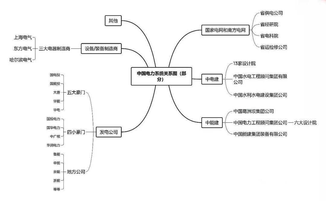 1、国家电网和南方电网 主要业务:以建设和运营电网为核心业务。 组成部分:各省电力公司、中国电力科学研究院。其中:省电力公司主要由省电科院、省经研院、省供电局、检修公司组成。 2、中国电力建设集团公司 来源:2011年由中国水利水电建设集团公司、中国水电工程顾问集团公司以及勘测设计企业、电力施工企业、装备修造企业改革重组而成。 主要子集团: 1)中国水电(SINOHYDRO),中国水利水电建设集团公司,前身为燃料工业部水力发电建设总局,后几经合并与拆分,2002年12月改组为中国水利水电建设集团公司,2009年11月整体改制并控股创立中国水利水电建设股份有限公司,2011年成为中国电建全资子公司。总部北京。 2)中水顾问(HYDROCHINA),中国水电工程顾问集团有限公司,前身为水利水电规划设计总局(院),主要分为中国水电顾问集团国际工程有限公司和中国水电顾问集团投资有限公司,2002年12月改组为中国水利水电建设集团公司,2011年成为中国电建全资子公司。总部北京。 原中国水电17个工程局: