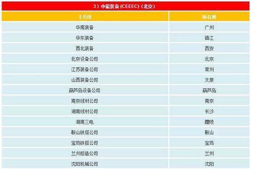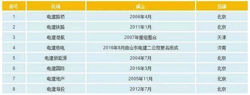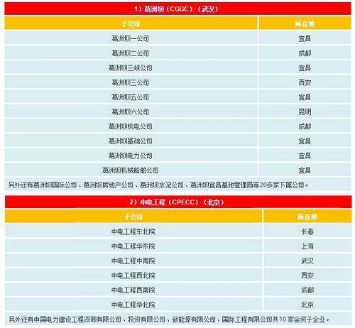 另有电建租赁、电建装备研究院、北京华科软、电建水治理、电建(德国)等85家二级子公司、控股公司。 3、中国能源建设集团有限公司 来源:由中国葛洲坝集团公司、中国电力工程顾问集团公司和电力勘察设计、施工和修造企业组成。 主要业务:集电力和能源规划咨询、勘测设计、工程承包、装备制造、投资运营等于一体的完整业务链的特大型骨干企业。 主要子集团: