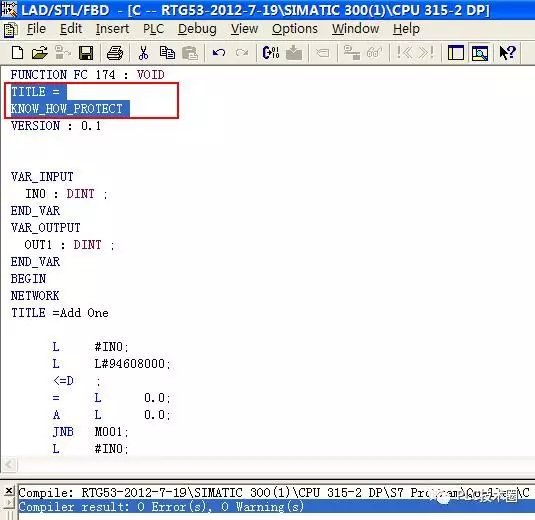 程序块保护实现步骤: 1.打开程序编辑窗口LAD/FBD/STL; 2.将要进行加密保护的程序块生成转换为源代码文件(通过选择菜单 File—>Generate source 生成); 3.在LAD/FBD/STL 窗口中关闭您的程序块,并在SIMATIC Manager项目管理窗口的source文件夹中打开上一步所生成的source文件; 4.在程序块的声明部分,TITLE行下面的一行中输入KNOW_HOW_PROTECT; 5.存盘并编译该source文件(选择菜单FileàSave,FileàCompile); 6.现在就完成了您程序块的加密保护;