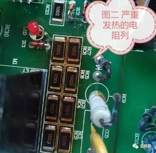 在变频器出现故障断电后,迅速拆机并做好防护工作用手指肚快速触摸变频器内部线路板上的相关电子元器件、IC集成块等。一旦发现某些元件同比温升明显,则故障必在它身上或者其周围线路当中!图二展示的为某品牌35KW变频器,因直流母线电压监测电阻阻值变质而引发直流母线过电压保护,从图中可感觉到事发时电阻所散发出的热量有多高!
