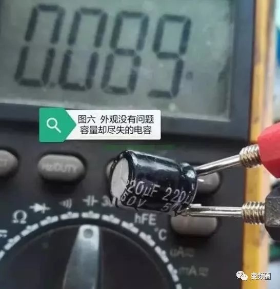 放——放电。变频器内部含有各种规格、各种容量的电解电容,这些电容由于容量减少所造成变频器发生故障的概率相比而言是十分高的。针对这些电容的检测,一般维修人员多采用观其形和使用电容表测量的方法进行检修,但这两种方法都存在一定的局限性。为此本人使用白炽灯灯泡/小电珠,在对被测对象充电结束后对其进行放电对比性测试,该方法可以直观地对比出被测对象的容量是否符合要求,据本人总结该方法的有效率在80%以上。图六当中的这支标称50V 220uF实际容量已经所剩无几的电解电容,便是采用放电检测方法鉴别出来的。
