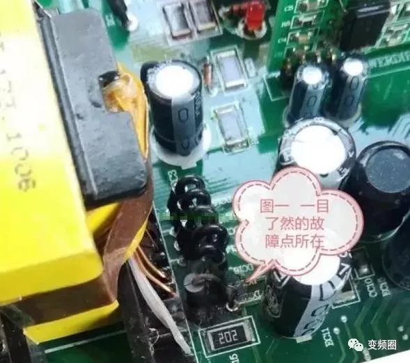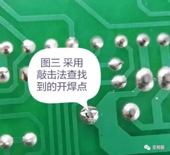 敲这种方法是针对第四种检测方法的补充,毕竟第四种方法仅能对小型的贴片元件行之有效,而对于部分大功率电子元器件或者存在高压危险的线路部分则不太方便操作。对此我们可改压为敲,利用绝缘工具在怀疑故障点附近适当用力敲击,大多数情况下是能快速锁定故障对象的。图三展示的为,用该种方法检测到的引发某小容量变频器间歇报超压故障的元件虚焊点!