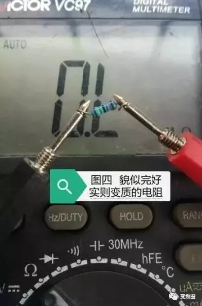 该方法主要依靠万用表检测,就当下而言多使用数字万用表进行。针对变频器各类故障检修而言,使用万用表解决搞定的约占65%。对于如何使用万用表测量,本人相信广大电工朋友都能熟练掌握运用,在此本人只强调一点:由于变频器内部多高压储能元件,在断电后切记先放电再经行测量作业,不然万用表难保呀!图四晒出的该只外观和颜色看起来都无异样,标称阻值为15KΩ的1/4W色环电阻,用万用表实测值已变为无穷大(由于该电阻变质,致使某品牌22KW变频器报出“输出电流不平衡”故障)!