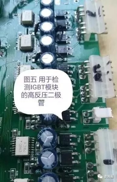 该方法说的是短接。在变频器维修尤其是当IGBT/IPM因损坏而被拆除后,单独通电检修脉冲驱动线路过程中,若驱动光耦型号为A316J这类含有对IGBT/IPM故障检测功能的芯片时,因模块损坏或拆除往往无法使光耦正常开通。此时则需要用导线将针对IGBT/IPM故障检测的元件(绝大部分为高反压二极管阳极)与变频器直流母线负端(有的标N或者GND)短接,以便欺骗变频器主控制器,让其认为功率模块完好继而达到驱动脉冲信号能正常发送的目的。图五展示的便是某品牌55KW变频器,脉冲信号驱动电路中针对IGBT模块检测的简介。