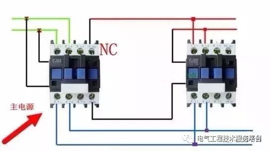 备用电源的线圈走主接触器的常闭点,主电源接触器吸合主电路导通。主电源断电,备用电源通过主接触器的常闭点导通。如果主电源恢复正常,备用电源断开。