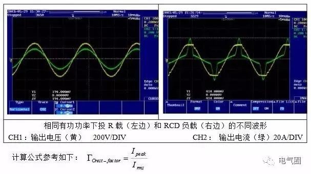 波峰因数定义及测试方法 波峰因数定义为交流信号峰值与有效值之比(峰均比),典型的波峰因数是:正弦波:1.414;方波:1;25%的占空比的脉冲:2 。 波峰因数(CREST FACTOR)的概念在UPS行业是用来衡量UPS带非线性负载的能力,对线性负载(R LOAD)而言,正弦波电流峰值Ipeak与均方根值Irms之比为1.414:1;在非线性负载(RCD LOAD)时,波峰因数则被认定为:在相同的有功功率条件下,非线性负载的电流峰值与非线性负载电流均方根值之比。实际测试波形参考如下: