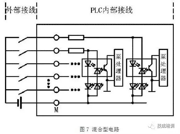 混合型输入电路 因为此类型的PLC公共端口既可以接外接电源的正极也可以接负极,同时具有源输入电路和漏输入电路的特点,所以我们可以姑且把这种输入电路成为混合型输入电路,如下图所示: