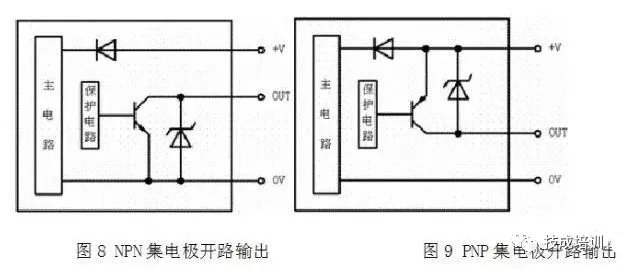 可以看出,NPN集电极开路输出电路的输出OUT端通过开关管和OV连接,当传感器动作时,开关管饱和导通,OUT端和OV相同,输出OV低电平信号;PNP集电极开路输出电路的输出OUT端通过开关管和+V高电平信号。