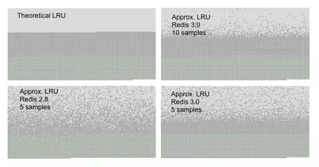上面这段代码实现了一个简单的LUR算法,代码很简单,也加了注释,仔细看一下很容易就看懂。 LRU在Redis中的实现近似LRU算法Redis使用的是近似LRU算法,它跟常规的LRU算法还不太一样。近似LRU算法通过随机采样法淘汰数据,每次随机出5(默认)个key,从里面淘汰掉最近最少使用的key。 可以通过maxmemory-samples参数修改采样数量: 例:maxmemory-samples 10 maxmenory-samples配置的越大,淘汰的结果越接近于严格的LRU算法 Redis为了实现近似LRU算法,给每个key增加了一个额外增加了一个24bit的字段,用来存储该key最后一次被访问的时间。 Redis3.0对近似LRU的优化Redis3.0对近似LRU算法进行了一些优化。新算法会维护一个候选池(大小为16),池中的数据根据访问时间进行排序,第一次随机选取的key都会放入池中,随后每次随机选取的key只有在访问时间小于池中最小的时间才会放入池中,直到候选池被放满。当放满后,如果有新的key需要放入,则将池中最后访问时间最大(最近被访问)的移除。 当需要淘汰的时候,则直接从池中选取最近访问时间最小(最久没被访问)的key淘汰掉就行。 LRU算法的对比我们可以通过一个实验对比各LRU算法的准确率,先往Redis里面添加一定数量的数据n,使Redis可用内存用完,再往Redis里面添加n/2的新数据,这个时候就需要淘汰掉一部分的数据,如果按照严格的LRU算法,应该淘汰掉的是最先加入的n/2的数据。 生成如下各LRU算法的对比图 图片来源:segmentfault.com/a/1190000017555834 你可以看到图中有三种不同颜色的点: 浅灰色是被淘汰的数据 灰色是没有被淘汰掉的老数据 绿色是新加入的数据