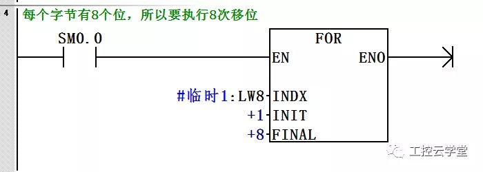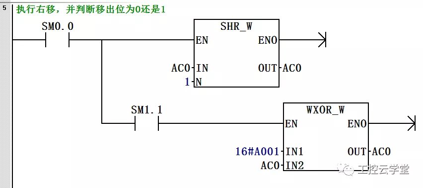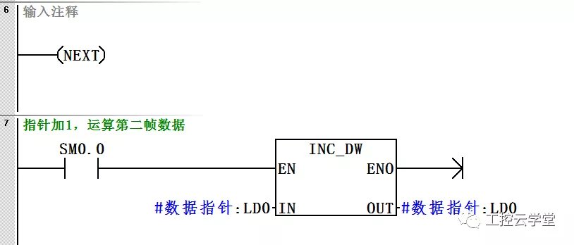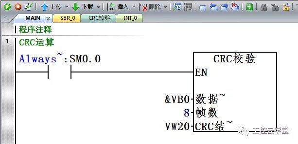 CRC即循环冗余校验码(Cyclic Redundancy Check):是数据通信领域中最常用的一种查错校验码,其特征是信息字段和校验字段的长度可以任意选定。循环冗余检查(CRC)是一种数据传输检错功能,对数据进行多项式计算,并将得到的结果附在帧的后面,接收设备也执行类似的算法,以保证数据传输的正确性和完整性。 在Modbus RTU通讯中数据报文中有一帧是CRC校验码,用来进行错误检测。其原理是由发送设备将数据帧进行一定的运算得出一个检验码,然后加在数据帧后一起发送过去,接收设备接收到数据后重新运算,再讲运算出来的校验码与发送过去的校验码进行比较,如果一致则说明数据无错误,如果不一致则说明数据传输错误。 CRC运算过程如下: CRC是先存入0 XFFFF到CRC寄存器,然后调用一个过程将消息中连续的8Bit字节与当前寄存器中的值进行处理。仅每个字符中的8Bⅰt数据对CRC有效,起始位和停止位以及奇偶校验位均无效。CRC产生过程中:每个8位字符都单独和CRC寄存器内容相异或(X0R),结果向最低有效位方向移动,最高有效位以0填充。LSB被提取出来检测,如果LSB为1,CRC寄存器单独和预置的值相异或,如果LSB为0,则不进行。整个过程要重复8次。在最后一位(第8位)完成后,下一个8位字节又单独和CRC寄存器的当前值相异或。最终CRC寄存器中的值,是消息中所有的字节都执行之后的CRC值。 下面为产生GRG的计算过程 1.将一个16位寄存器的值设置为FFFF(hex),称之为CRC寄存器。 2.将数据的第一个8Bit字符与16位CRC寄存器的低8位进行异或计算,并把结果存入CRC寄存器。 3.CRC寄存器向右移一位(向着最低位LSB),最高位MSB补零,移出并检查LSB。 4.如果LSB为0:重复第三步(另一个移位)如果LSB为1:CRC寄存器与预置值:A001H(1010000000000001B)进行异或操作。 5.重复第3与第4步直到8次移位全部完成,此时一个8Bit数据处理完毕。 6.重复第2与第5步直到所有数据全部处理完成。 7.最终CRC寄存的内容即为CRC值。 注意:CRC校验码使用时低字节在前,高字节在后。 用S7-200 SMART编写运算程序如下: