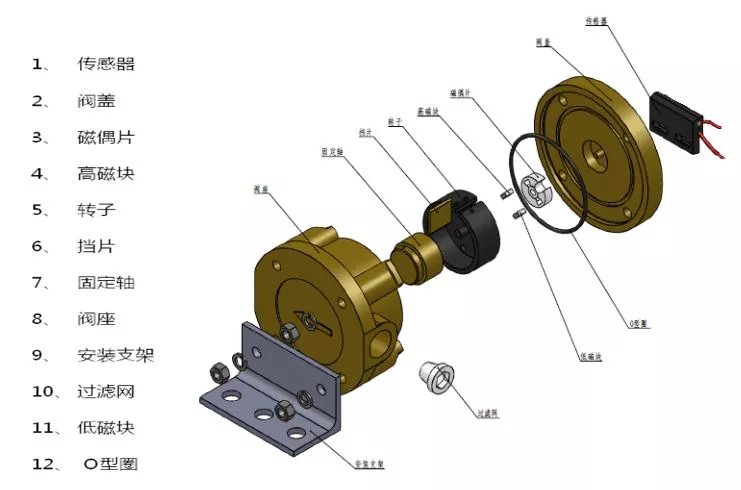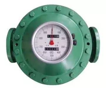 椭圆齿轮流量计(又称排量流量计,齿轮流量计),属于容积式流量计一种,在流量仪表中是精度较高的一类。由计量箱和装在计量箱内的一对椭圆齿轮,与上下盖板构成一个密封的初月形空腔(由于齿轮的转动,所以不是绝对密封的)作为一次排量的计算单位。当被测液体经管道进入流量计时,由于进出口处产生的压力差推动一对齿轮连续旋转,不断地把经初月形空腔计量后的液体输送到出口处,椭圆齿轮的转数与每次排量四倍的乘积即为被测液体流量的总量(原理见图)。流量计主要是由壳体、计数器、椭圆齿轮和联轴器(分磁性联轴器和轴向联轴器)等组成。